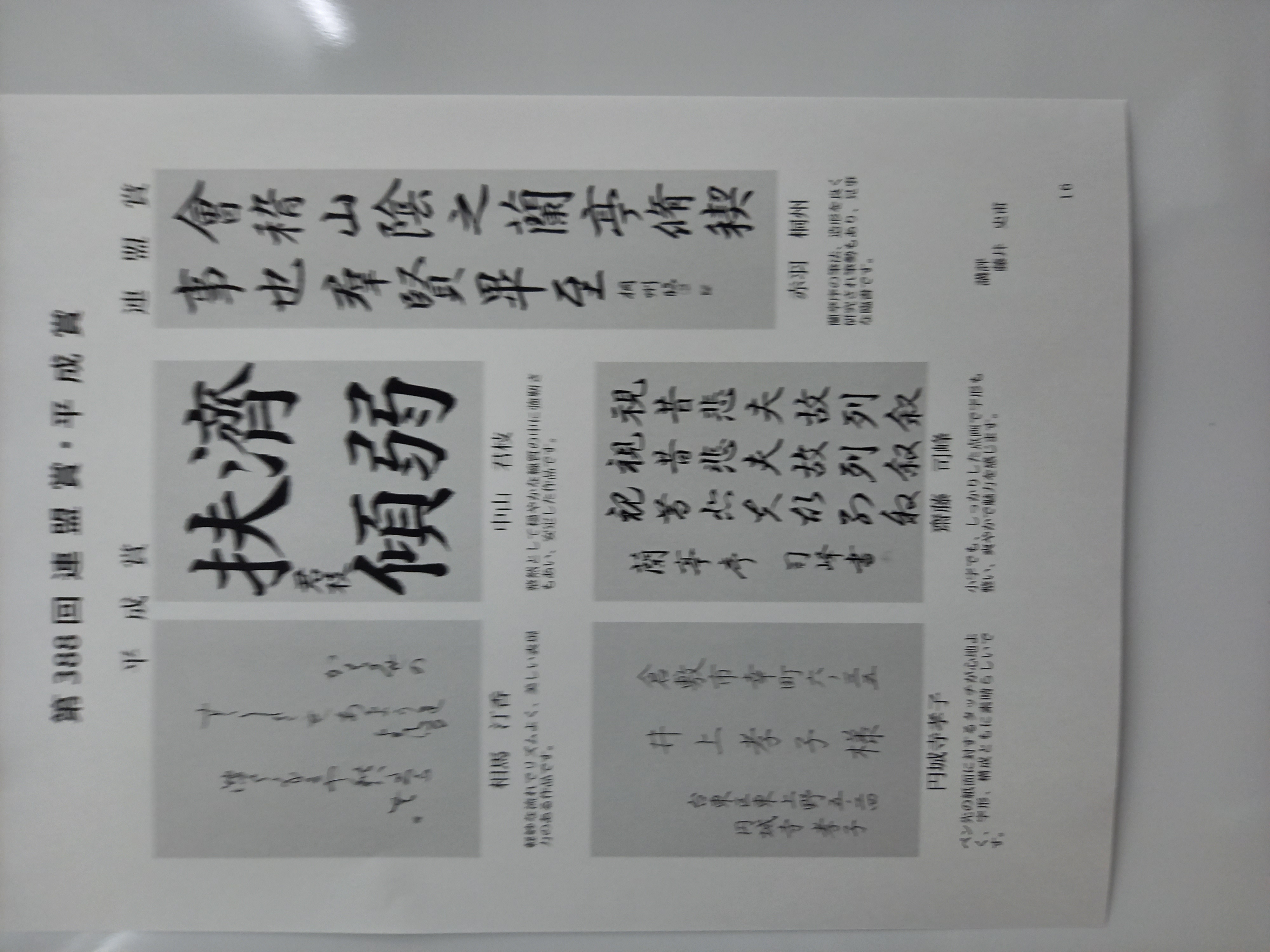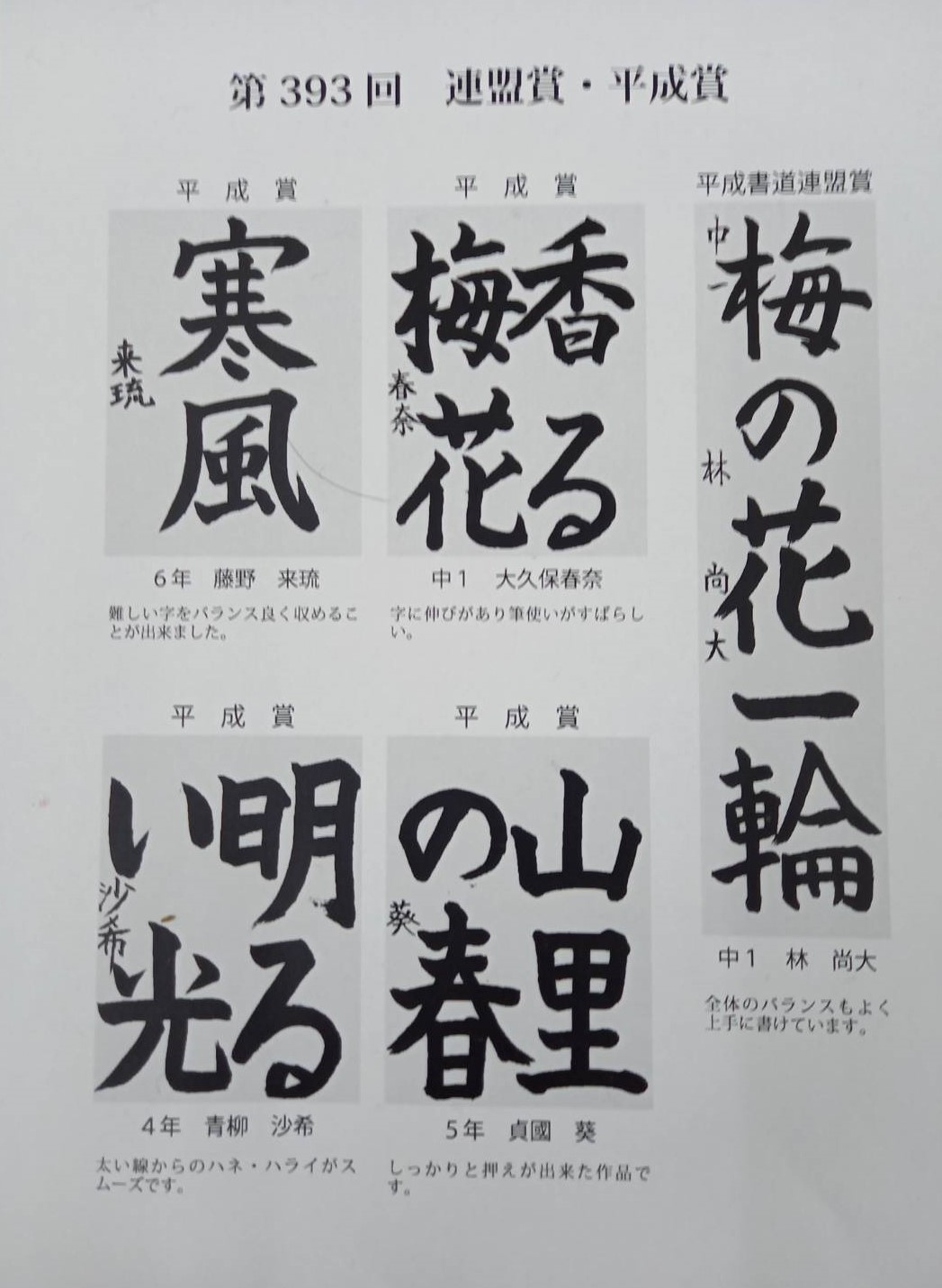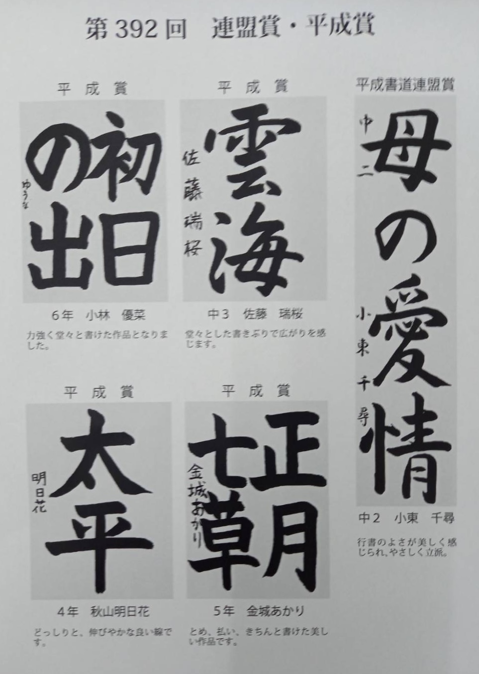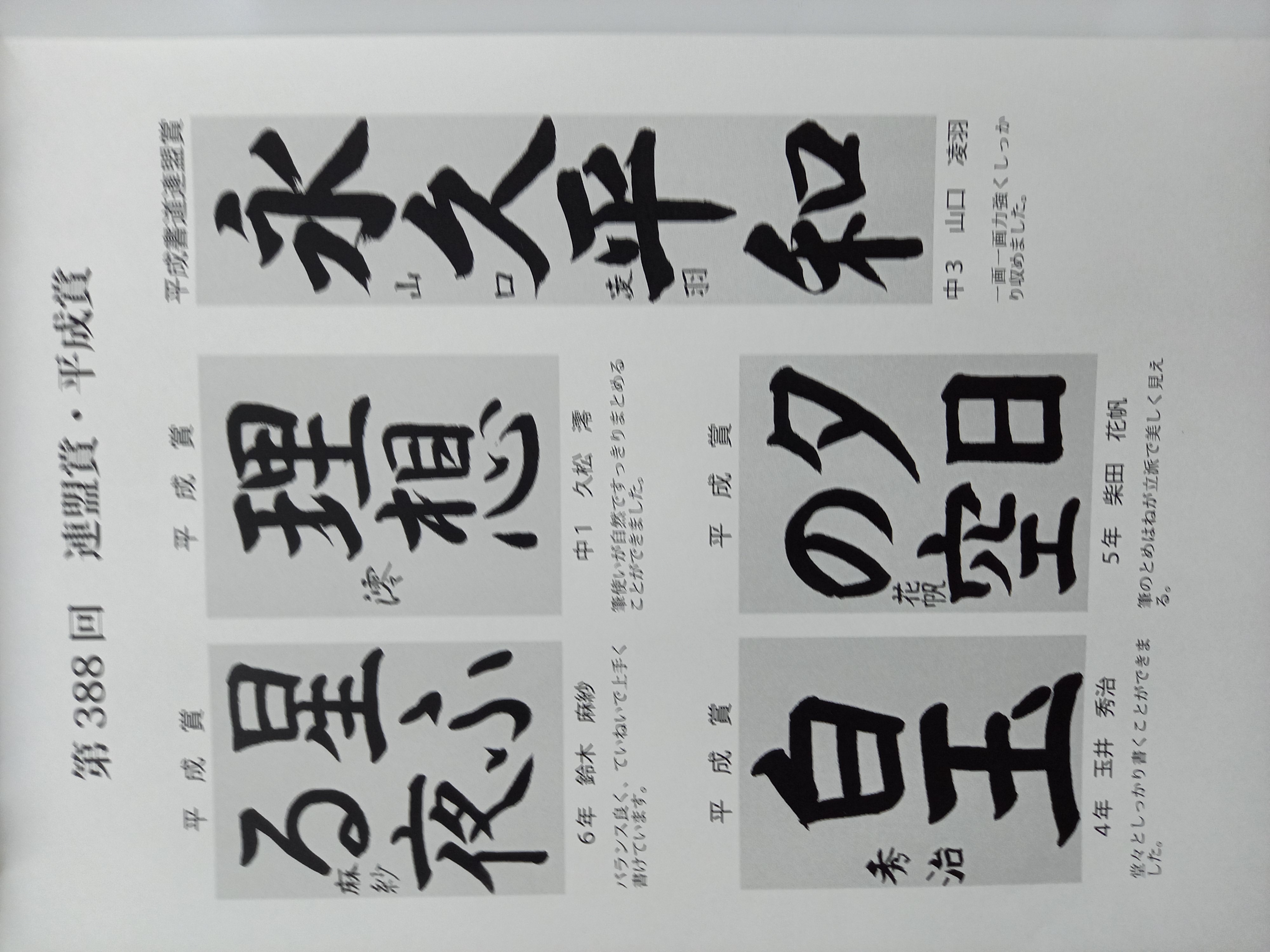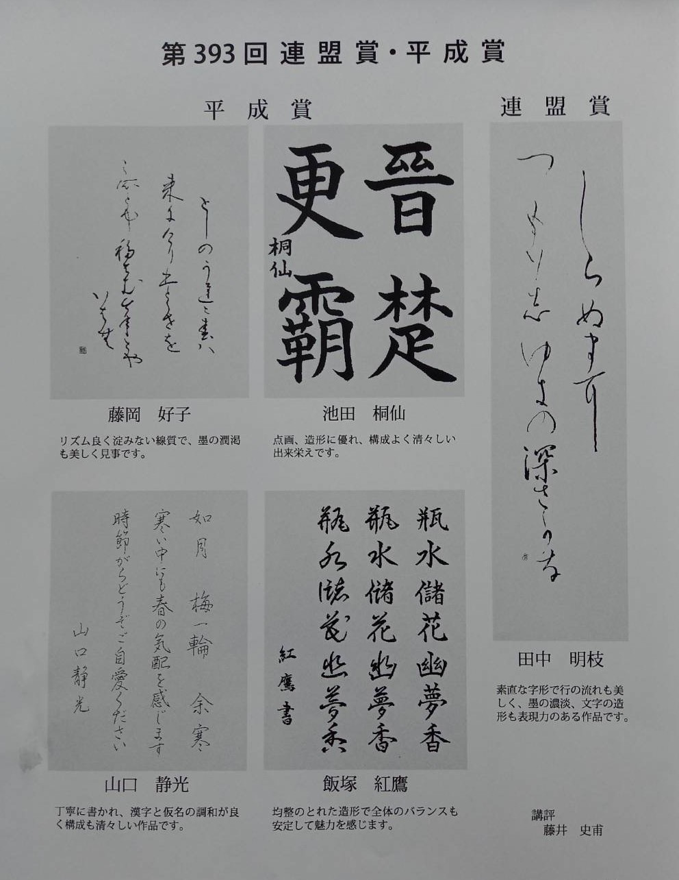 一般部 連盟賞 田中 明枝 平成賞 漢字: 池田 桐仙 仮名: 藤岡 好子 細字: 飯塚 紅鷹 ペン字:山口 静光 学生部 連盟賞 林 尚大(中1) 平成賞 大久保 春奈(中1) 藤野 来琉(小6) 貞國 葵(小5) 青柳 沙希(小4)