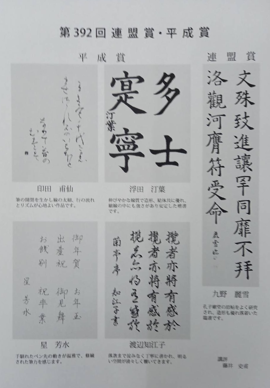 一般部 連盟賞 九野 麗雪 平成賞 漢字: 浮田 汀葉 仮名: 印田 甫仙 細字: 渡辺 知江子 ペン字:星 芳水 学生部 連盟賞 小東 千尋(中2) 平成賞 佐藤 瑞桜(中3) 小林 優菜(小6) 金城 あかり(小5) 秋山 明日花(小4)